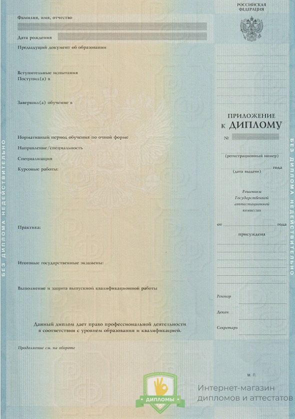 Изготовленный документ в компании «ОК-Дипломы» оформлен согласно действующим в Российской Федерации законам, соответствует нормам и особенностями, присущим тому или иному учебному заведению, имеет все элементы защиты.