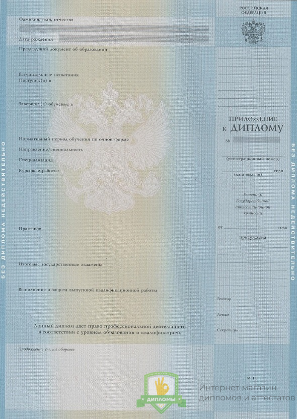 Изготовленный документ в компании «ОК-Дипломы» оформлен согласно действующим в Российской Федерации законам, соответствует нормам и особенностями, присущим тому или иному учебному заведению, имеет все элементы защиты.