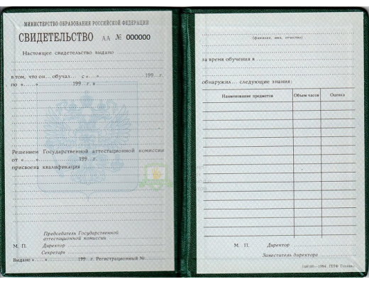 Прибрести свидетельство о повышении квалификации СССР до 1995 год вы можете в компании «ОК-Дипломы». Работаем на профильном рынке более 20 лет, предлагая клиентам высококачественный сервис и разумные цены. У нас свидетельство о повышении квалификации СССР до 1995 год выполняется на оригинальном бланке Гознак, дополняется подлинными подписями и печатями.