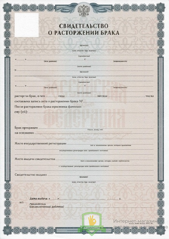 Прибрести свидетельство о расторжении брака 2019 - 2026 год вы можете в компании «ОК-Дипломы». Работаем на профильном рынке более 20 лет, предлагая клиентам высококачественный сервис и разумные цены. У нас свидетельство о расторжении брака 2019 - 2026 год выполняется на оригинальном бланке Гознак, дополняется подлинными подписями и печатями.